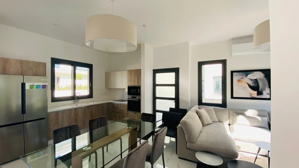 The 4-bedroom semi-detached houses follow a modern modular design with exterior wood finishes and private landscaped gardens with mature trees and a convenient automatic irrigation system. The 2 bedroom homes include under floor heating and double glazed windows for maximum comfort throughout the year as well as provisional electric shutters, solar system for hot water, ample parking as well as access to the children’s playground and communal swimming pool.