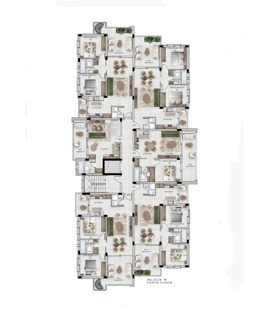 Spanning an area of 10,000 m², the development features five apartment buildings within a secure, guarded complex. The site includes recreational areas for both work and leisure, such as children’s playgrounds and barbecue stations.