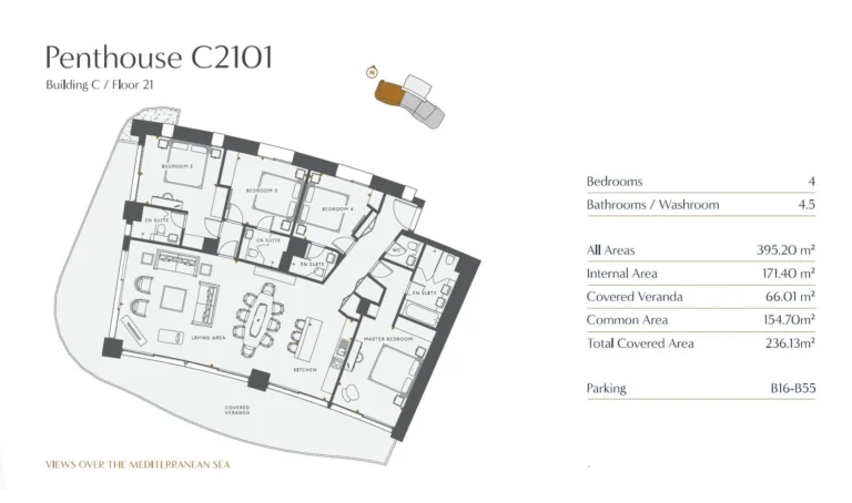 The penthouse is complemented by five-star services and facilities, including a private owner’s club, concierge, expansive spa areas, indoor and outdoor swimming pools, fully equipped gyms, underground parking, and secure gated access. Smart building technologies and premium finishes throughout ensure an unrivalled living experience, blending comfort, elegance, and modern sophistication.