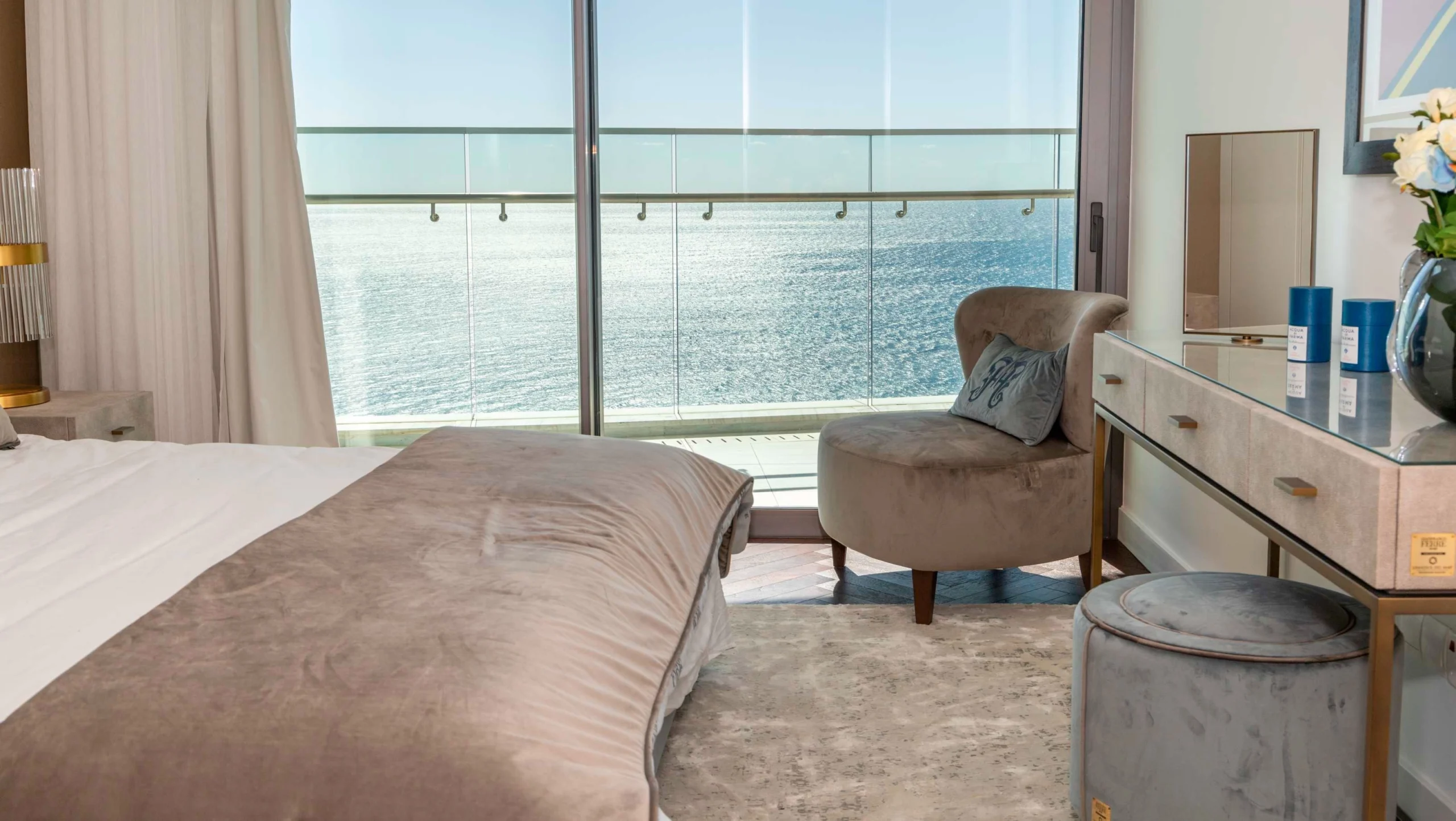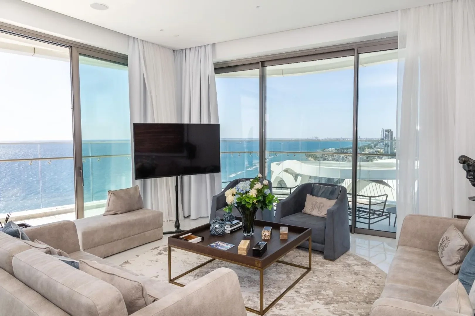 This luxurious four-bedroom seafront penthouse offers panoramic views of the Mediterranean Sea from every angle. With its striking curvilinear high-rise design, it represents a new era of contemporary architecture on the island.