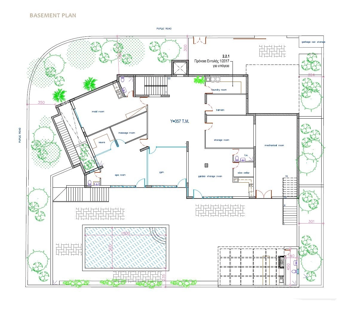 On the Ground floor, 681 m² – Office, TV room, Living room, Kitchen and dining area, Pantry, Walk-in wardrobe, Guest toilet, Server room, Elevator, Garage for 2 cars, Large covered veranda, Garden.