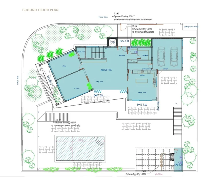 On the Ground floor, 681 m² – Office, TV room, Living room, Kitchen and dining area, Pantry, Walk-in wardrobe, Guest toilet, Server room, Elevator, Garage for 2 cars, Large covered veranda, Garden.