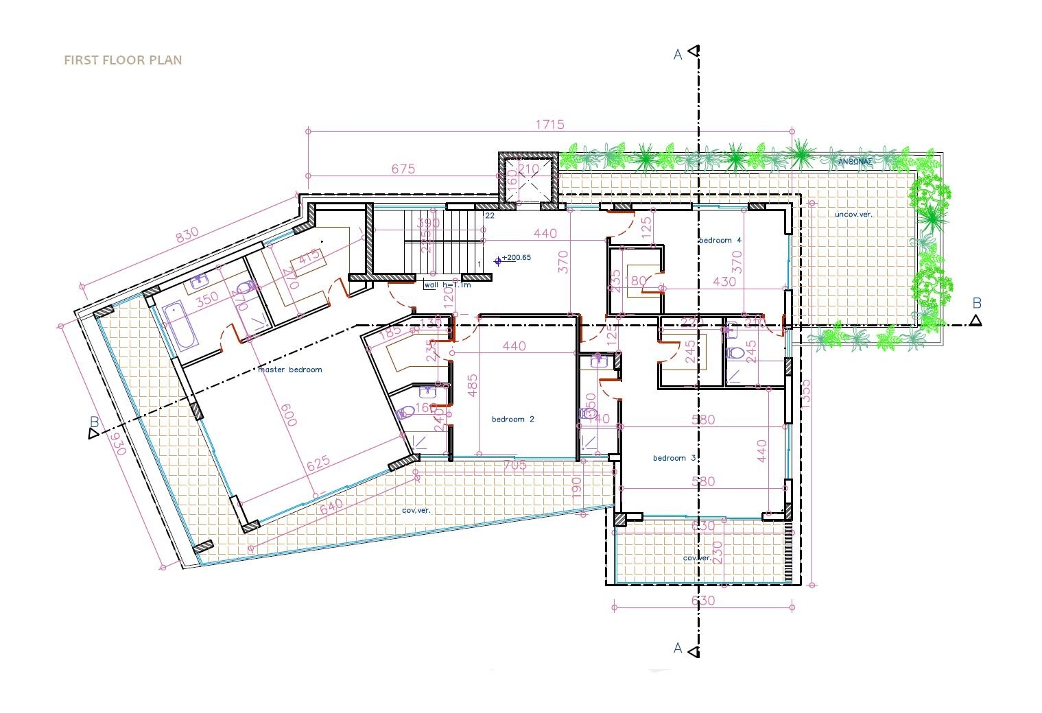 On the First floor, 316 m² – Master bedroom with en-suite and walk-in wardrobe, other 3 bedrooms with en-suite and walk-in wardrobe, Covered and uncovered verandas, Garden.