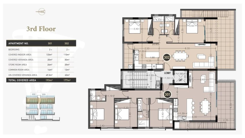 The development consists of three floors, each featuring one spacious two-bedroom and one three-bedroom apartment, all crafted to the highest standards. Every home includes a covered veranda, offering an inviting outdoor space to unwind. Additionally, residents will benefit from covered parking, ensuring convenience and security in this exclusive living environment.