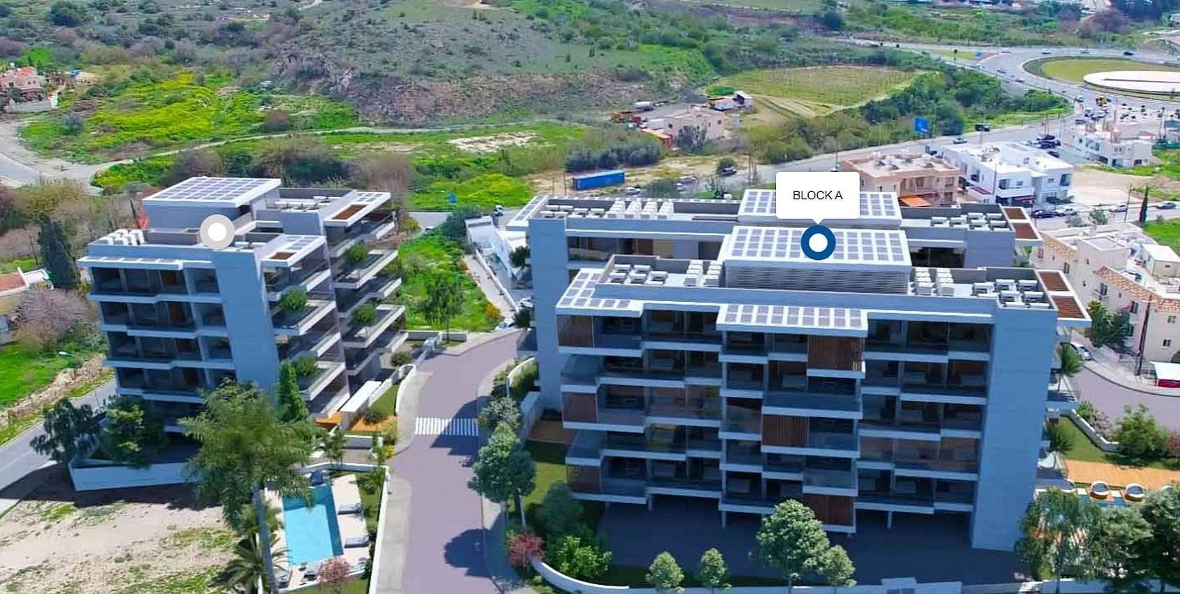 This is a stunning development with two five-storey blocks of apartments for sale in Paphos. Within the two blocks, one can find a range of 2 and 3 bedroom apartments, the majority of which will have excellent sea views. A number of features can be found in the development, such as a communal swimming pool for each block, solar panels which will improve the energy efficiency of the building, and of course the beautiful modern design of the building that comes with sleek lines, large window openings and concrete finishing.