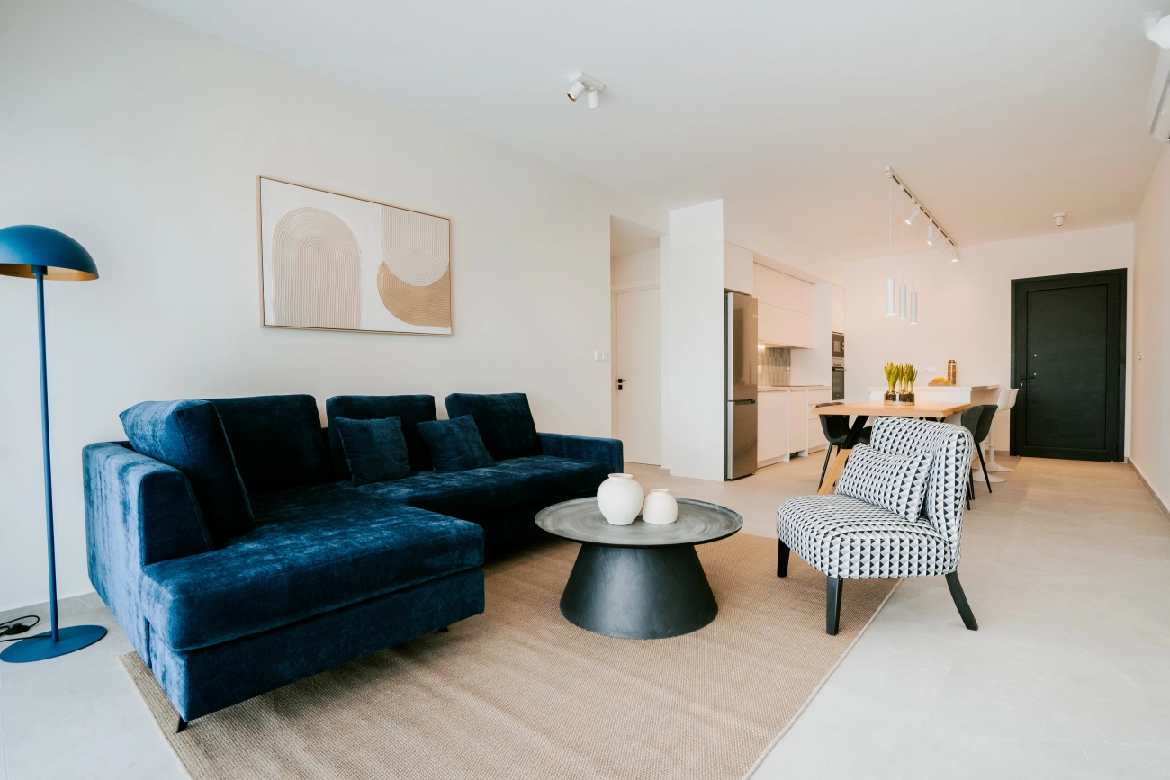 Apartment for sale in a modern residential complex in Geroskipou, Pafos. The spacious layout includes a living room, a kitchen and a balcony decorated in a modern style. The complex is built according to high European standards using advanced materials, including effective thermal insulation solutions and solar panels for water heating. For residents, there is a swimming pool, a playground, covered parking, a storage room and an elevator. The closed territory of the complex with a video intercom system ensures security. Air conditioning is included in the price. The complex is conveniently located near urban infrastructure, including shops, schools, cafes and transport hubs.
