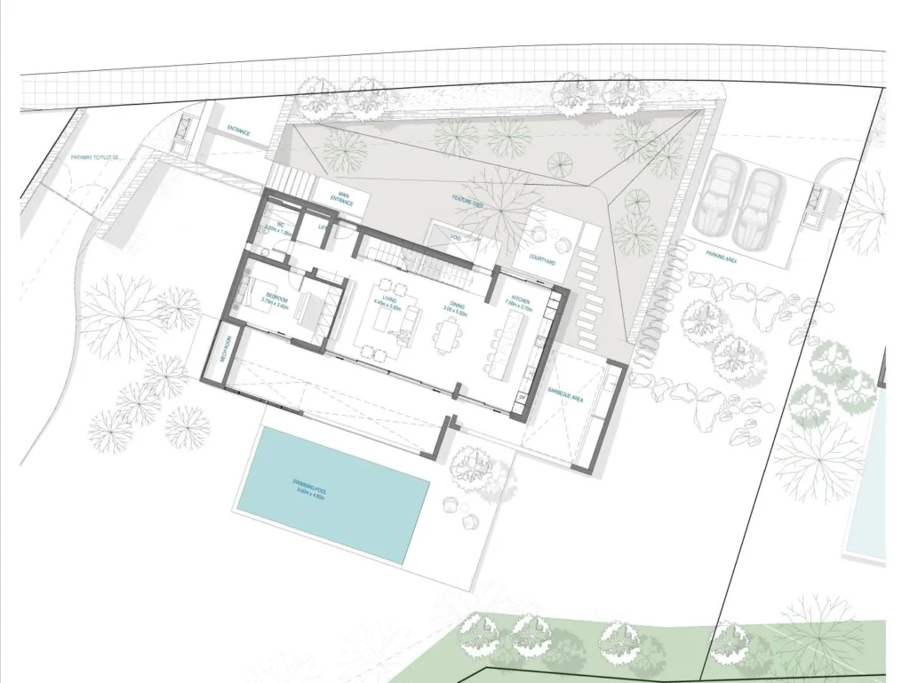 For sale is a three-storey off-plan house with 5 bedrooms. The project was designed to harmoniously combine modern style with the picturesque surroundings. The total area of the land plot with a swimming pool and landscape is 1644 m2. The total living area is 248 m2 plus 20 m2 of outdoor veranda. Two covered parking spaces. The area is mostly covered with shrubs, lawns and trees. Included in the price are underfloor heating, VRV system, built-in MIELE appliances and a private pool.