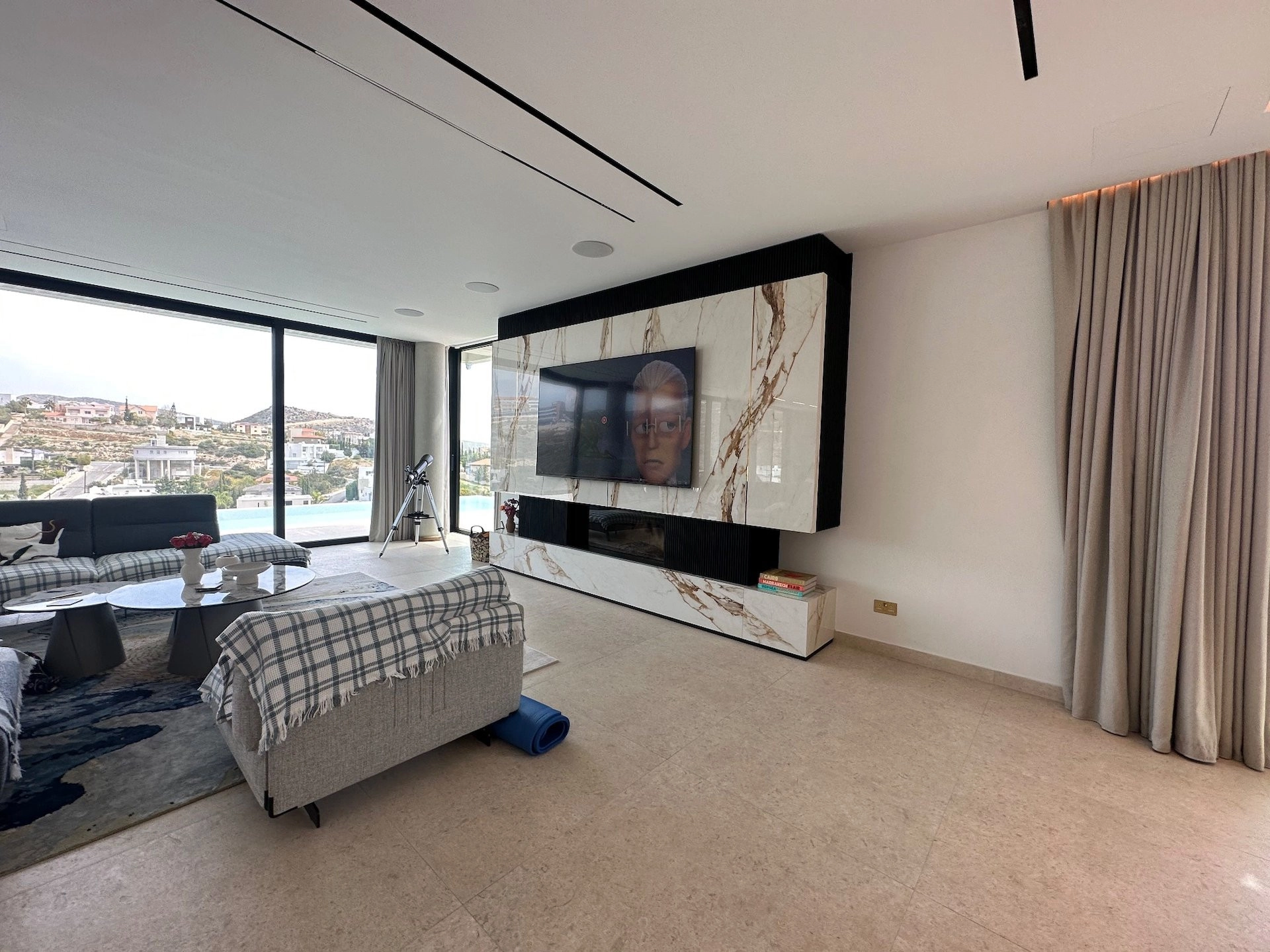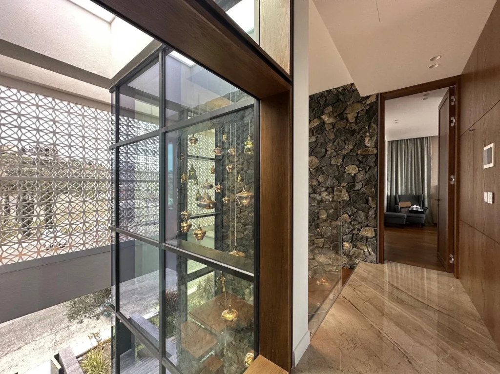High ceilings and solid wood doors lend a sense of grandeur throughout the home, while patio doors on all sides lead to the magnificent outdoor pool area. The infinity overflow pool with mineral water creates a serene oasis, and the built-in bar and BBQ area are perfect for alfresco entertaining.