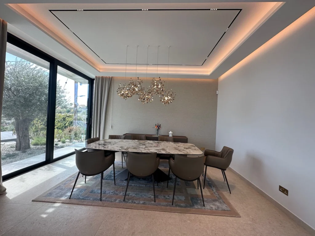 As you enter the home, you're greeted by a grand entrance featuring a striking staircase. The ground floor boasts a spacious open-plan living area, including a fully equipped Scavolini kitchen, with an adjacent utility/secondary kitchen for added convenience. Two elegant lounge areas, a separate dining room, and a private office provide ample space for both relaxation and work. A guest WC completes the ground level.