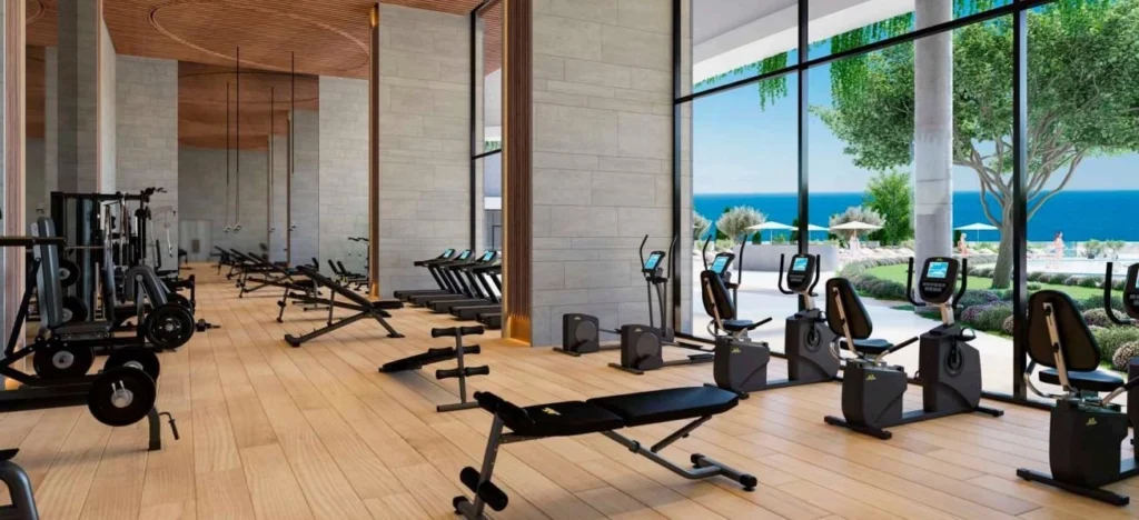 The amenity profile is especially powerful. At the heart of the development is a south-facing elevated podium rising approximately 9 metres above sea level, designed as a landscaped resident environment with over 4,300 sq.m of outdoor facilities. This level incorporates a 50-metre infinity pool, a sea-facing gym, refined lobby spaces, wellness facilities, and leisure areas that give the project the atmosphere of a private waterfront resort rather than a conventional apartment scheme.