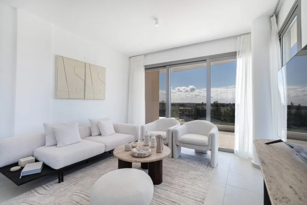 Residents benefit from ample parking, concierge services, landscaped gardens covering over 75% of the development, and access to large free-form swimming pools, children’s pools, Jacuzzi baths, and a playground. The location provides easy access to Limassol’s largest shopping mall, water park, international schools, pristine beaches, and the upcoming golf course, while also being within a short drive of both international airports and the scenic Troodos mountains.