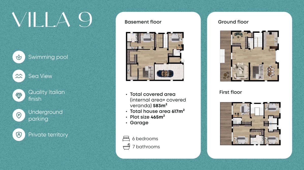 This magnificent six-bedroom villa is the largest residence in the community, positioned directly on the seafront with uninterrupted views of the Mediterranean. Spanning nearly 900 m² of total area, it offers unrivaled space, sophistication, and privacy.