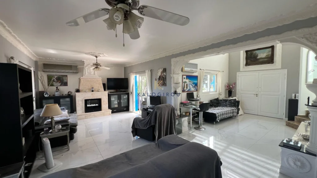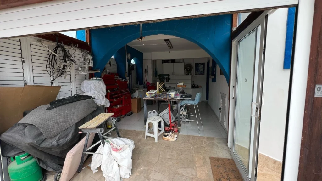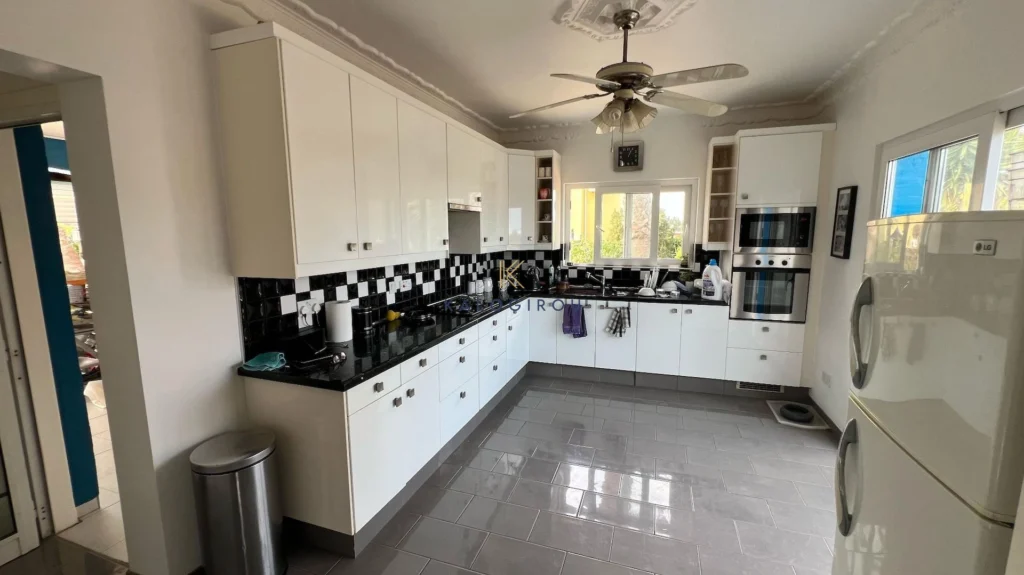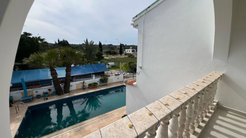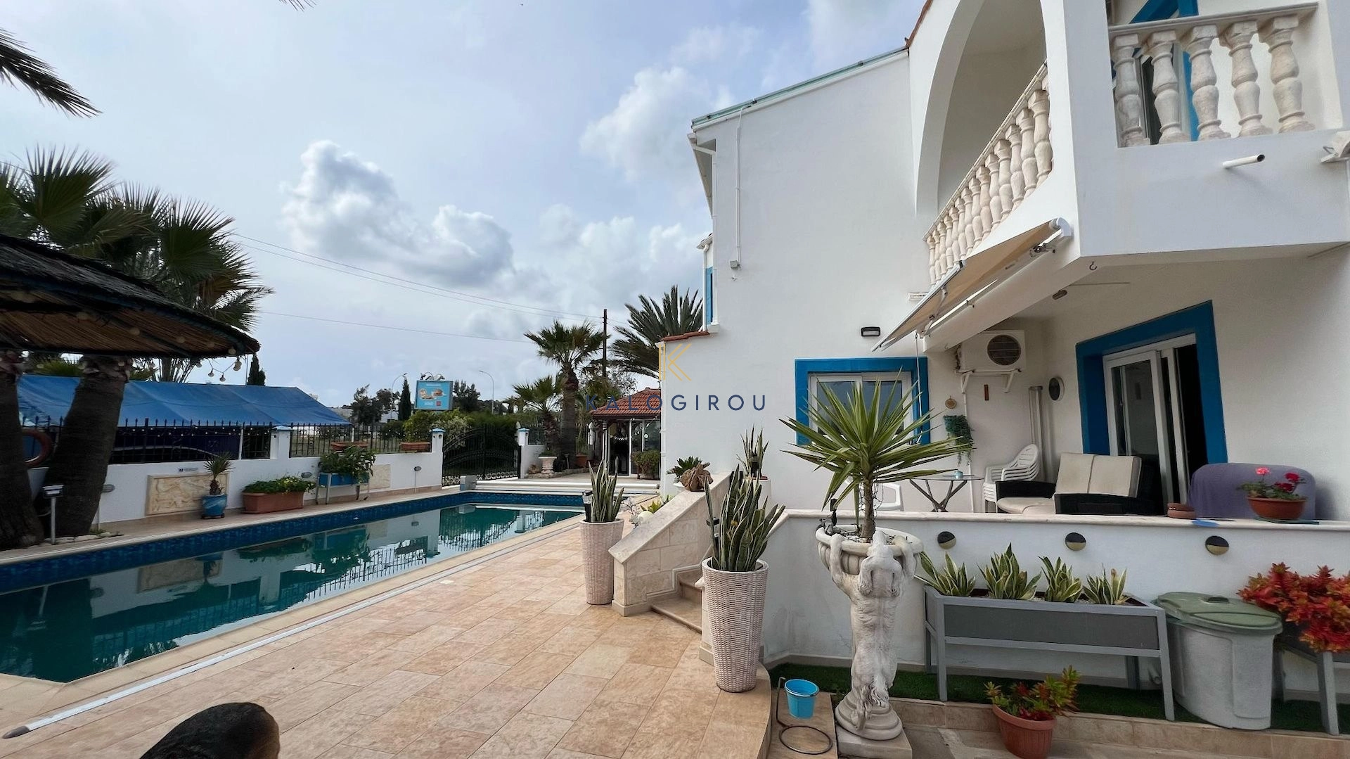 Detached House for sale in Paralimni area, Famagusta. It is a two story with total internal covered area of 156 sqm. The ground floor consists of an open plan kitchen, living room, dining area and a bathroom. The upper floor consists of a main bathroom with shower & wc, three bedrooms and covered verandas. Externally, the house has garden, swimming pool, bbq area, kiosk and garage.