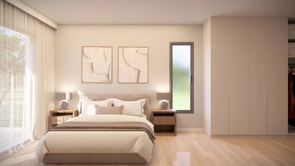 The villas feature a bright and airy open-plan ground floor, where the kitchen, dining, and living areas flow harmoniously—perfect for family life or entertaining. Large windows enhance the connection between indoors and out, filling the space with light and tranquility. A guest WC is conveniently located on this level.
