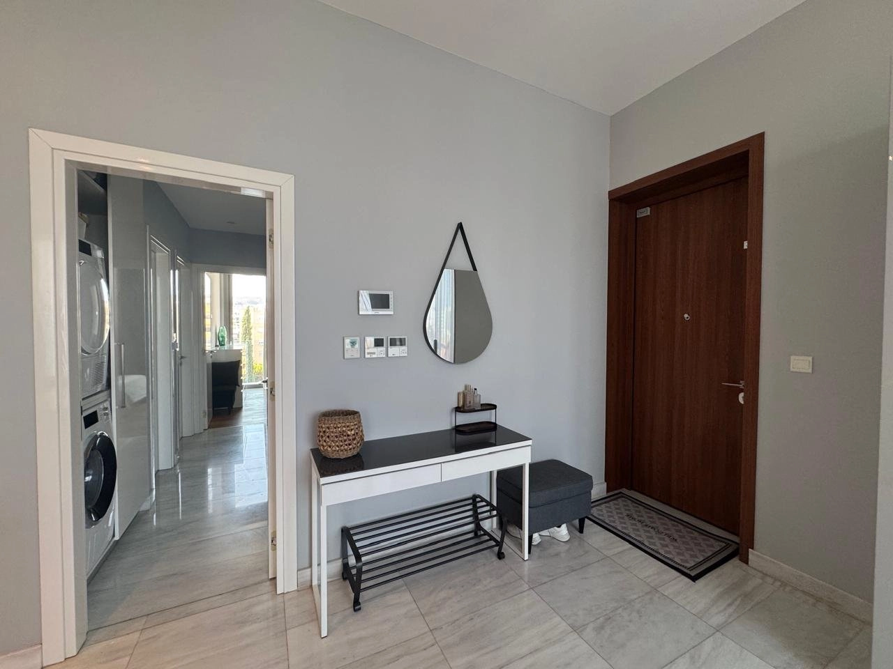 The apartment features a modern renovation, comes fully furnished, and is equipped with top-of-the-line appliances. With a total internal area of 89 sq.m. and an additional 14 sq.m. of balconies, the space is thoughtfully laid out and filled with natural light, thanks to floor-to-ceiling windows that offer stunning sea views.