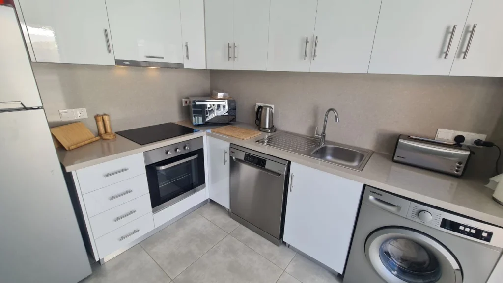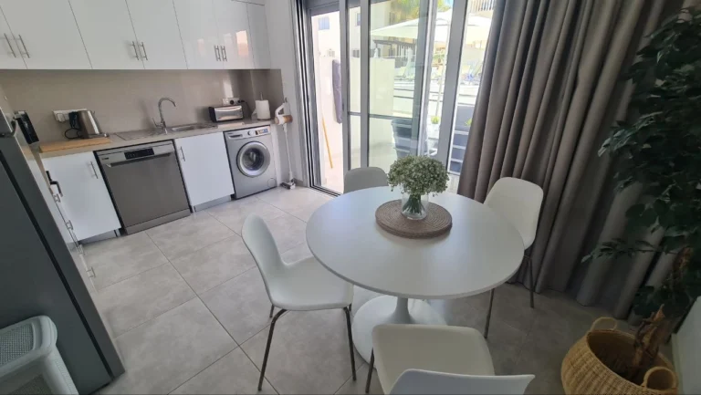 Modern townhouse with two bedrooms and three bathrooms for sale in the heart of Kapparis, Famagusta, just steps away from beautiful beaches, shops, and restaurants. Located in a small complex of 12 townhouses and 12 apartments with a communal pool, kids’ area, and gardens. The property offers 90 m² of internal space, 50 m² of uncovered veranda, and 20 m² of balconies. Fully furnished, it features an open-plan living area with a fitted kitchen, guest WC, two en suite bedrooms with balconies, and direct access to the pool from the rear veranda. Includes private parking. Communal fees are approximately €750 per year.