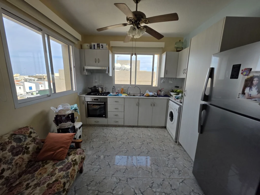2-bedroom apartment for sale on the third floor in Paralimni, Famagusta. The internal area is 55 m², complemented by a 70 m² private roof garden with partial sea view. The apartment includes one bathroom, new air conditioning units, solar panels, appliances, and furniture. The building was constructed in 2009, with no elevator or storage room. Parking is available. Full title deeds.