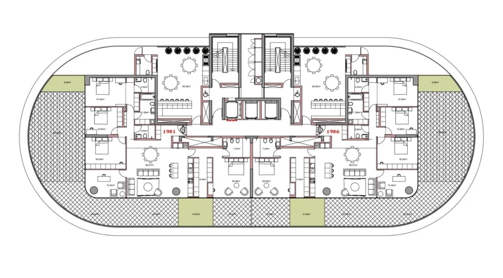 An absolutely unique feature comprises two lounge/barbeque areas at each residential floor (except the penthouses) with centralized extraction system and all facilities.