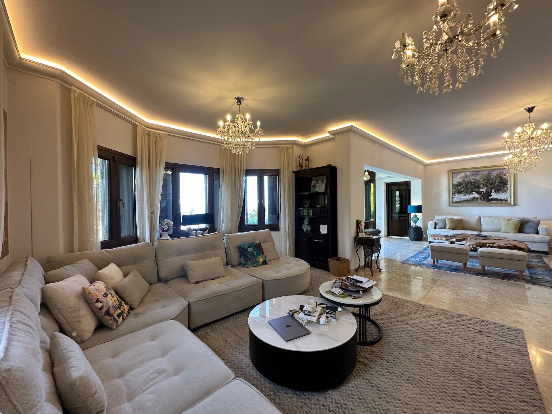 The villa benefits from comforts including geothermal heating, a VRV air-conditioning system, and mature landscaped gardens that enhance the natural beauty of the surroundings. While some modernization is required, the property's rare land size and premium location with completely unobstructed sea views, make it a truly valuable find with enormous potential.