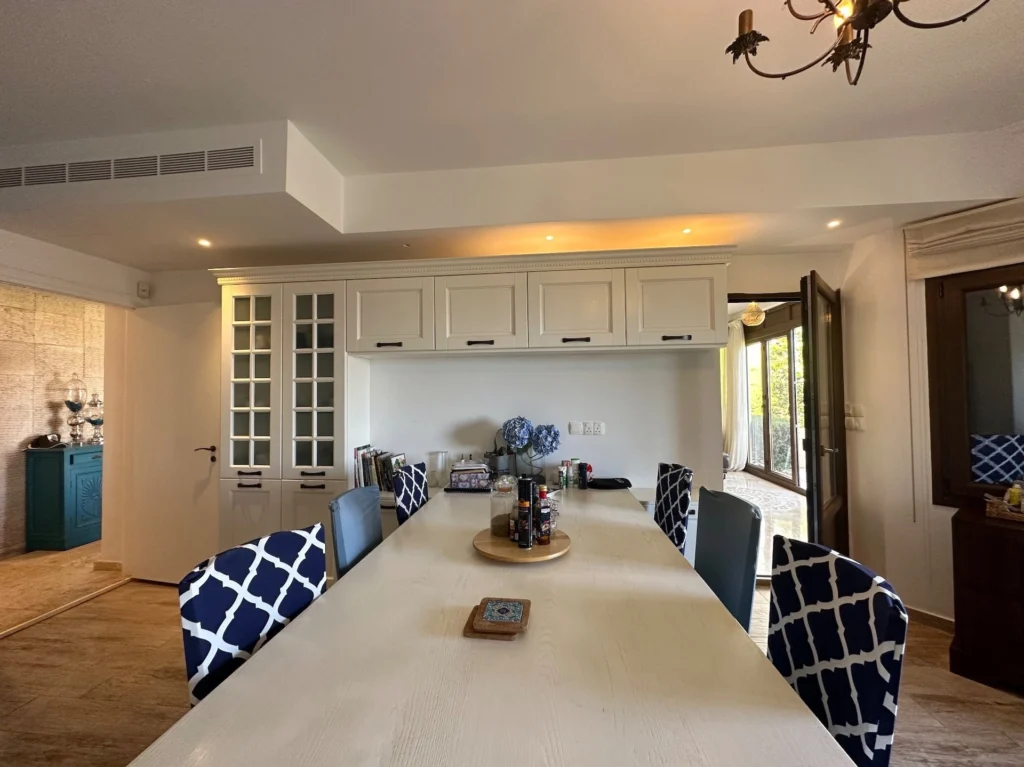 Set on a generous 1,351sqm plot in the prestigious area of Agios Tychonas, this delightful villa offers stunning panoramic sea views and exceptional potential. Designed with both comfort and functionality in mind, the home features an inviting entrance hall, a spacious living and dining area with direct access to the rear garden, a cozy TV room, and a fully-equipped separate kitchen with breakfast/dining space. Additional ground floor amenities include a laundry room, guest WC, a private office, and three bedrooms—all with en suite facilities, ideal for family living or guest accommodation.