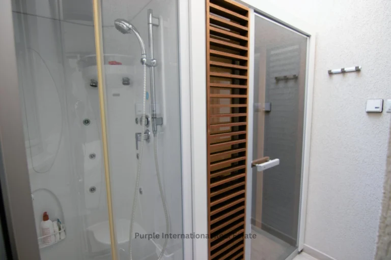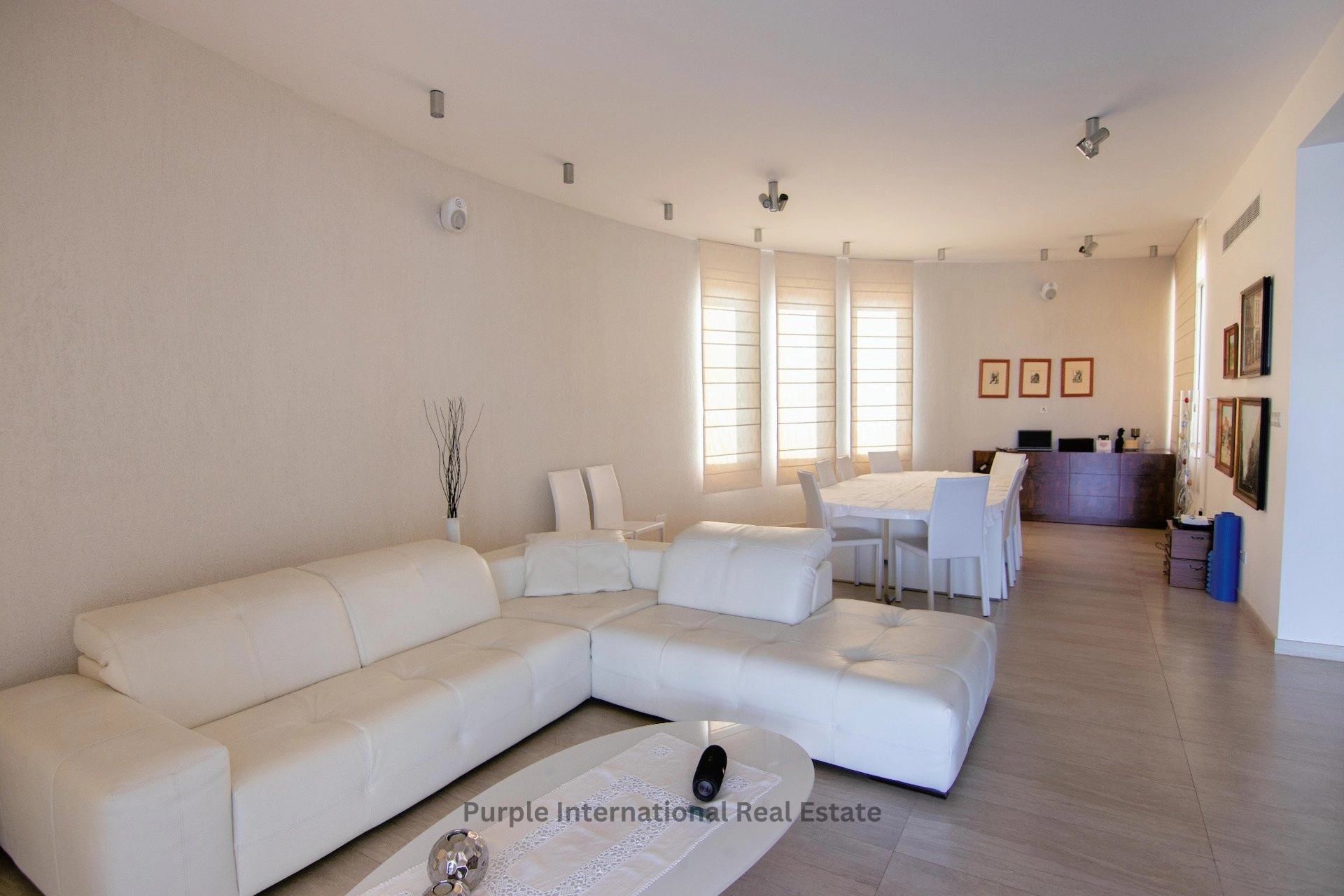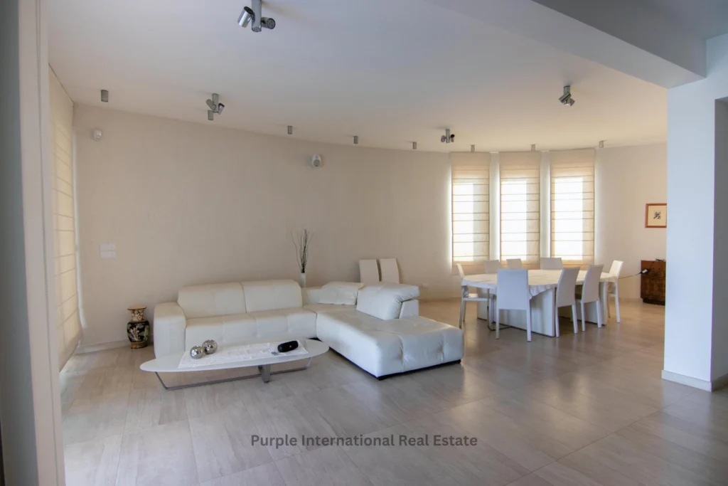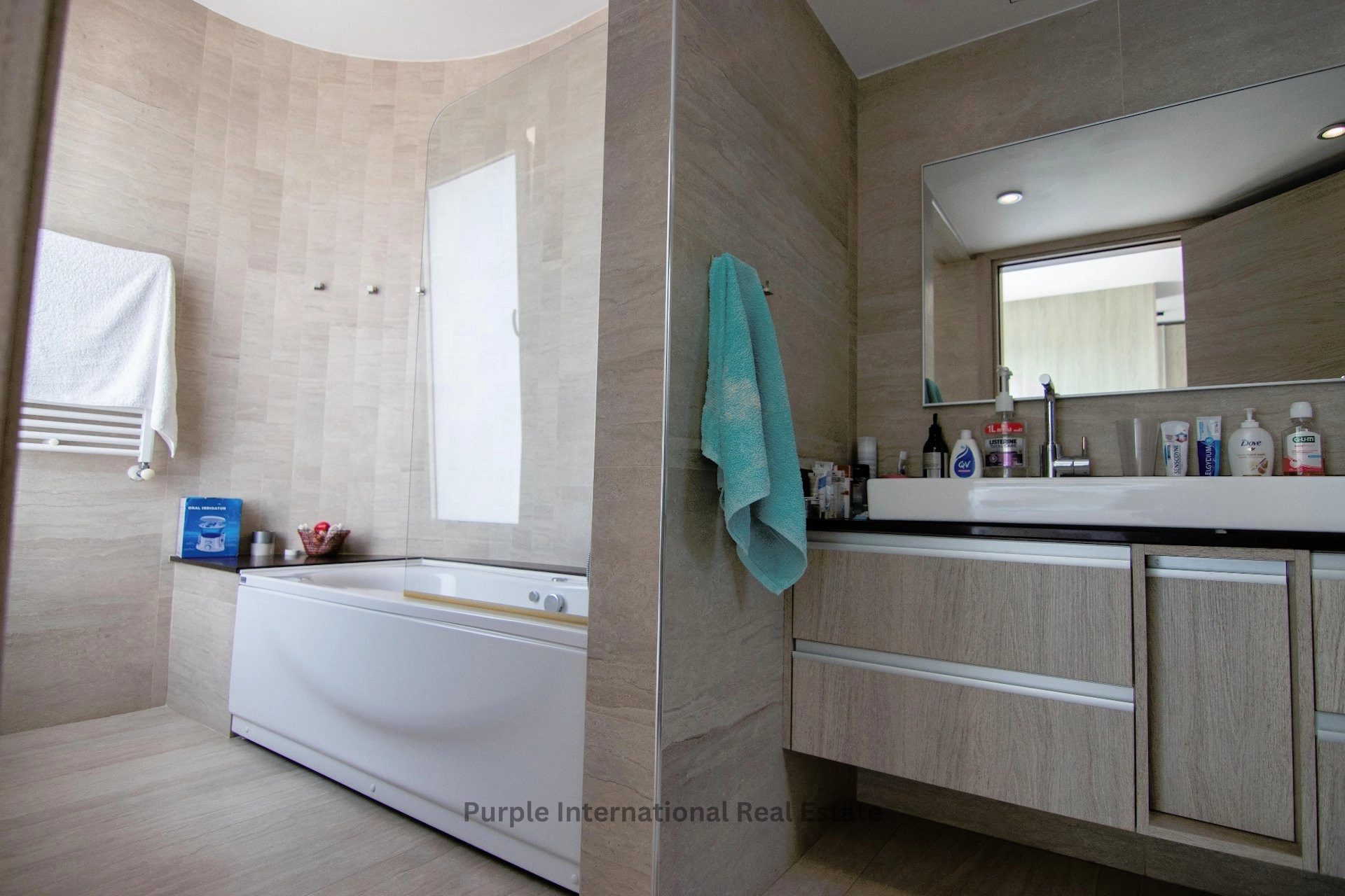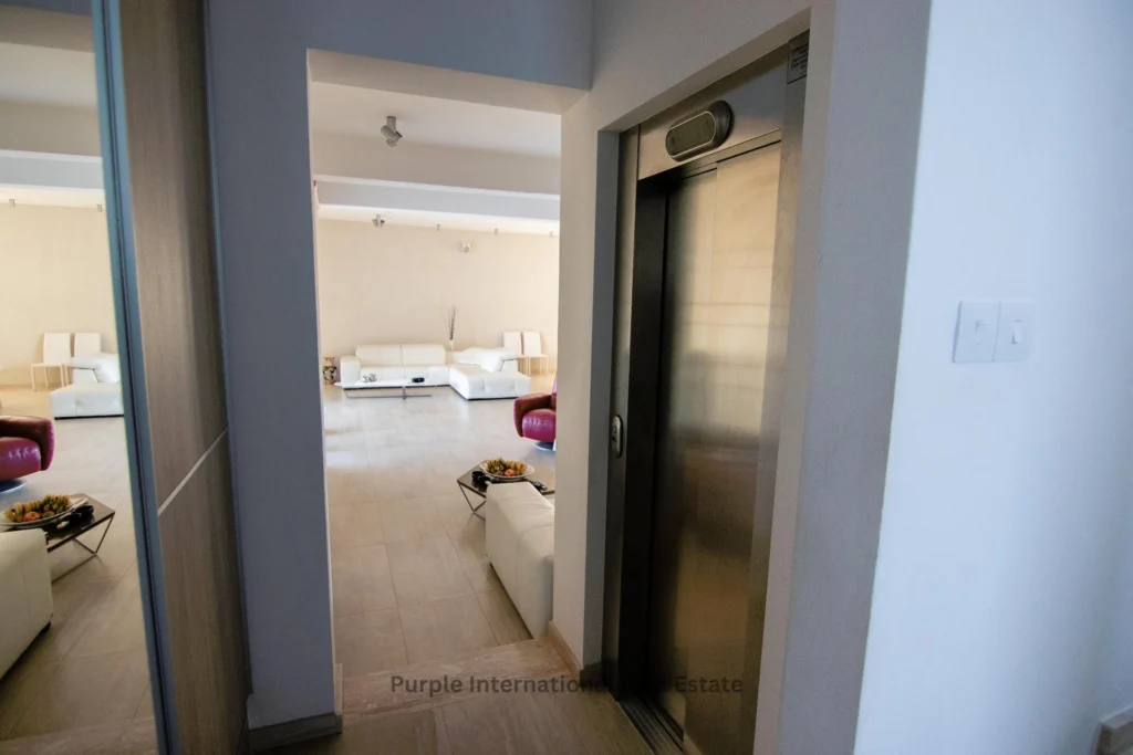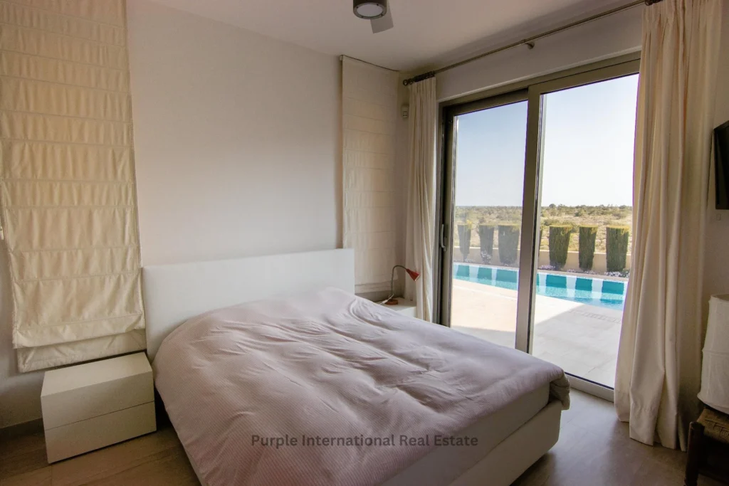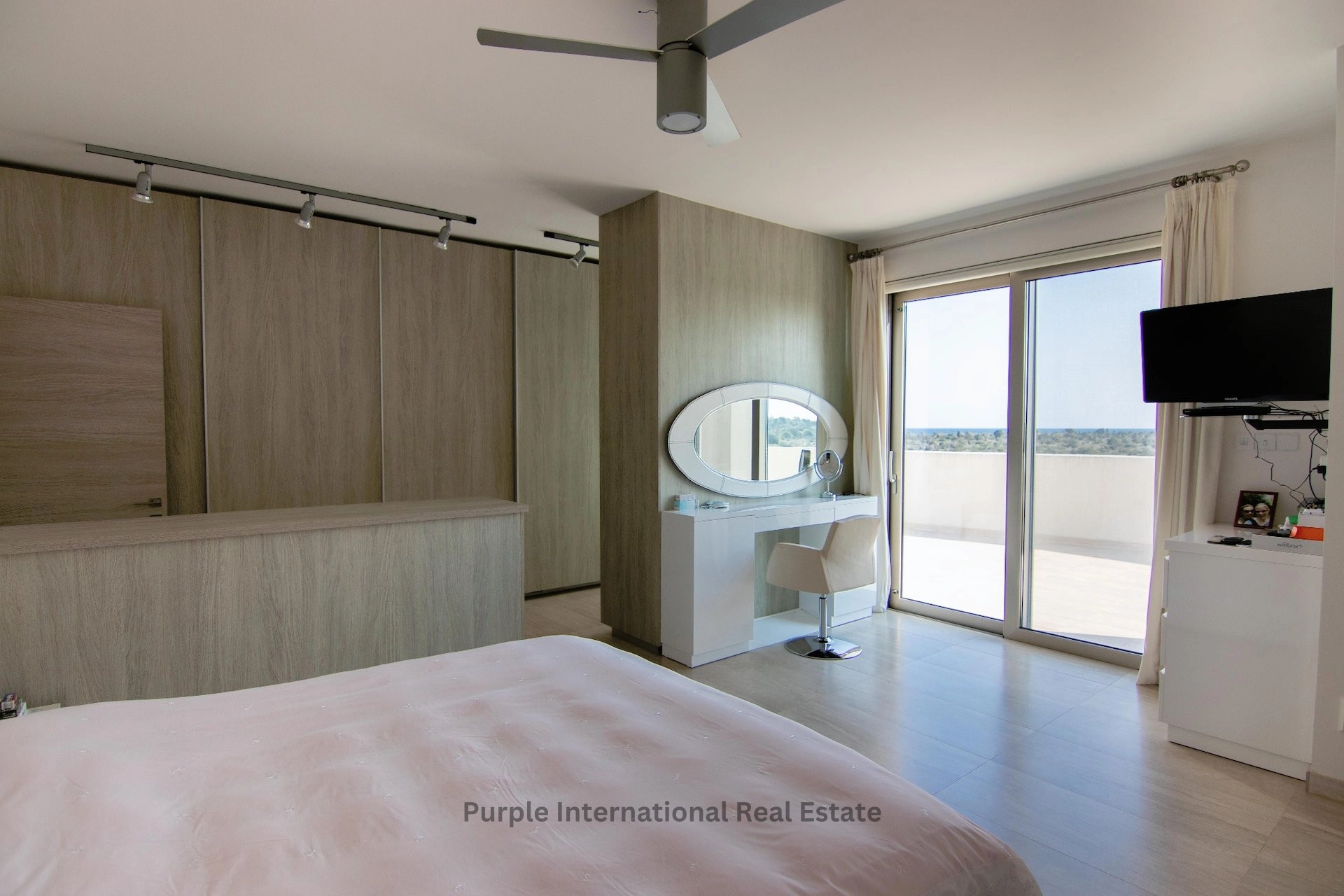 The vast master bedroom features an en-suite bathroom, shower room, a sauna, and a large private veranda offering panoramic sea views. The villa is also equipped with an elevator, providing access from the basement up to the roof garden which offers breathtaking views of Potamos, Ayia Thekla, and even Cape Greko!