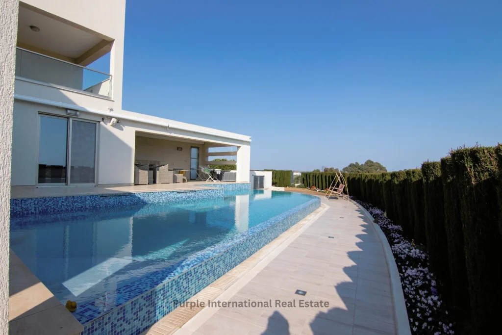 The villa sits on a substantial plot, featuring an enormous infinity overflow swimming pool and ample outdoor space for al fresco dining, sunbathing, and outdoor entertainment, perfect for unwinding and relaxation.