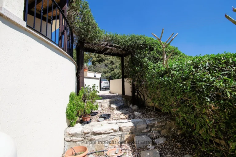From the utility room, you can access the side covered veranda with a pergola, providing plenty of space to enjoy your morning coffee or outside dining. An open veranda continues around to the front of the kitchen, dining room, and master bedroom, all with patio doors and views of the hills and sea. The pergola overlooks a terraced low-maintenance garden, featuring aromatic jasmine plants and herb plants.
