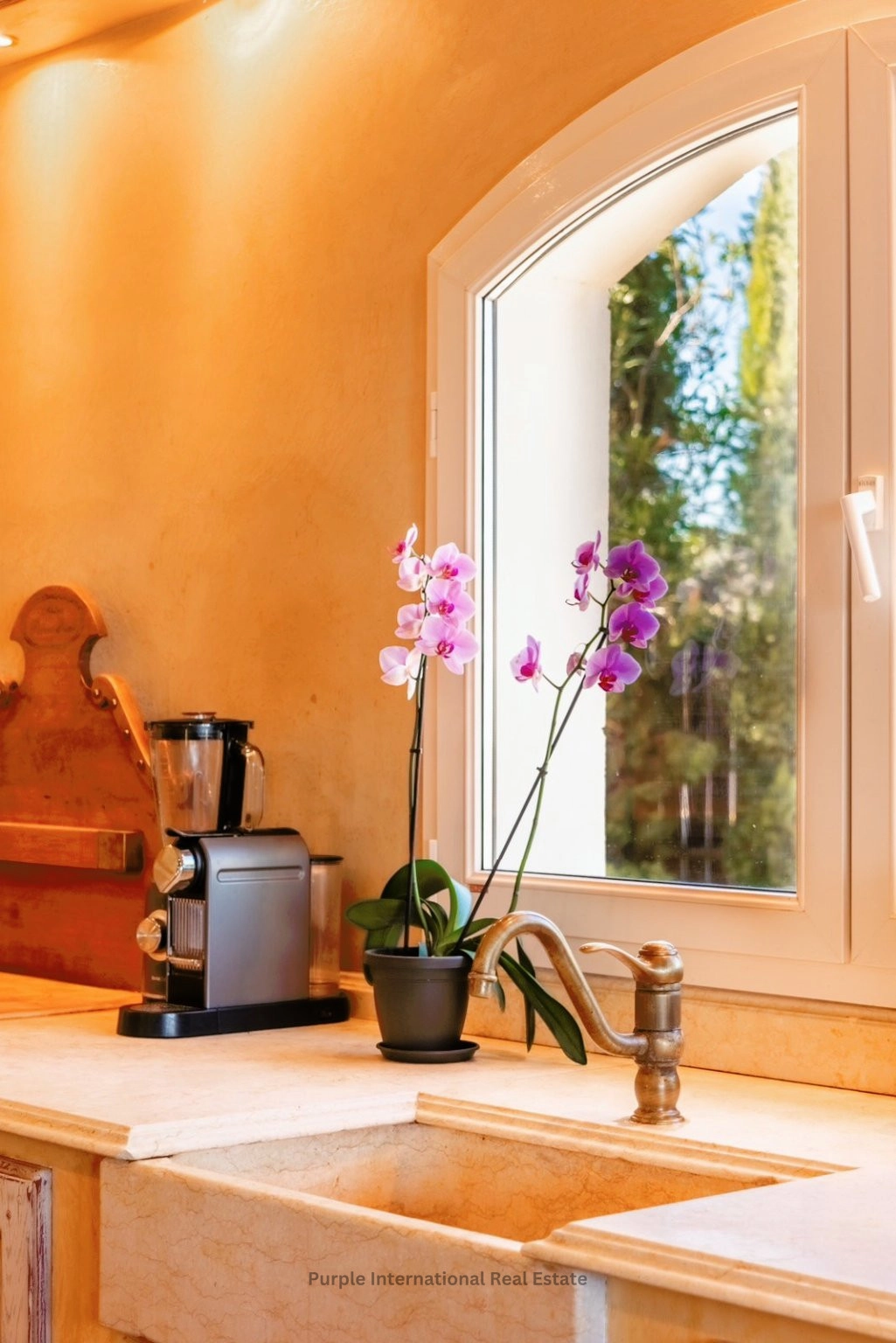 From the living area you can step out to the stunning terrace, pool and the beautifully designed garden adorned with lush foliage and trees. Whether seeking shade or basking in the sun, there are plentiful spaces to relax and revel in the elevated vantage point with its lovely sea views and peaceful surroundings.