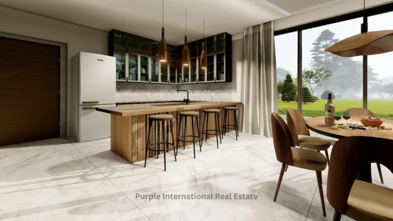 Upon entry, an open-plan layout welcomes you, combining the kitchen, living, and dining areas for an inviting social space. The stylish kitchen, finished with a natural granite countertop, complements the ceramic-tiled flooring throughout. The kitchen and dining space flow into the living area, which opens up to views of the private pool and barbecue area. A guest bathroom completes this floor.