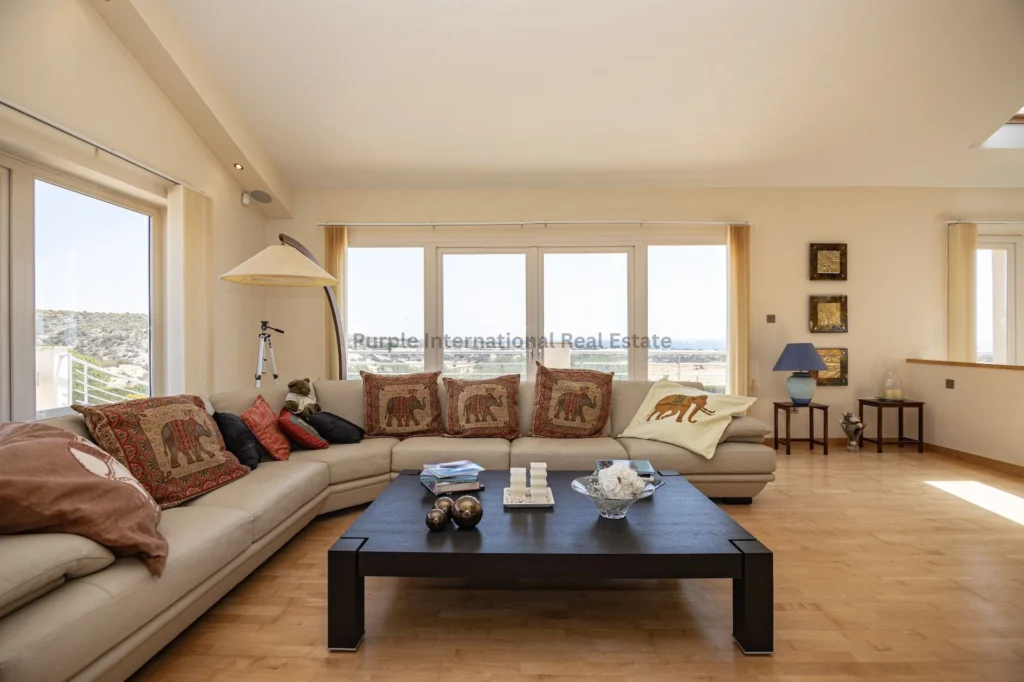 Second Floor: From the kitchen, a few steps lead to an unparalleled lounge area adorned with expansive windows that flood the space with natural light and frame panoramic sea and countryside vistas. These windows open onto a generous veranda, ideal for savoring sunsets.