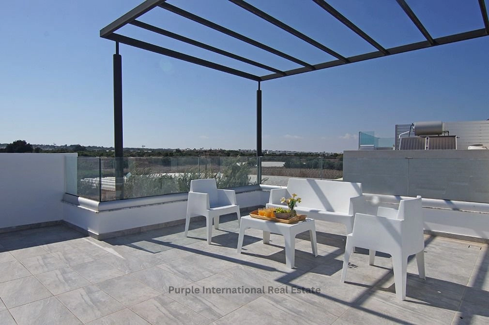 The villa boasts three spacious bedrooms, three modern bathrooms, a private swimming pool, and an impressive 80 m² roof garden designed for panoramic views and relaxing outdoor living. Its thoughtfully designed layout seamlessly connects indoor and outdoor spaces, creating a harmonious flow that enhances year-round enjoyment of the terrace and landscaped garden.
