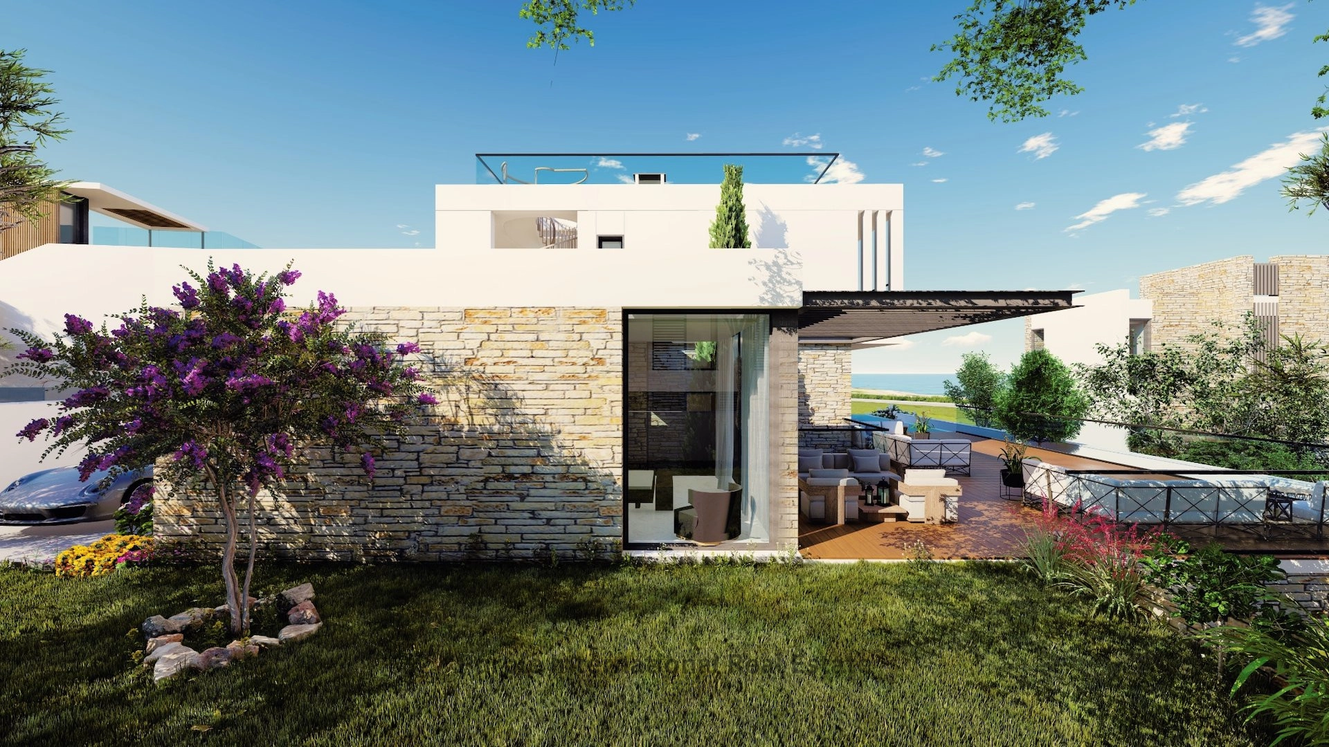 For sale is an exclusive off-plan detached villa in the sought-after area of Tombs of the Kings, offering a spacious internal area of 166 m². This modern villa features three bedrooms and three bathrooms, designed for comfortable family living. The open living and dining area is complemented by a central AC system, ensuring a pleasant atmosphere year-round. An elevator provides easy access between floors.