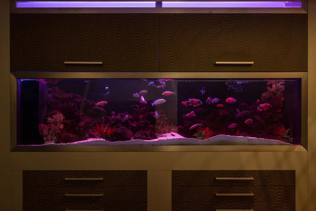 The ground floor houses a double open-plan solid-wood parquet living room furnished with Italian furniture, a modern fireplace, a guests’ toilet (designed by Antonio Citterio) alongside a guests’ wardrobe and a 10-person dining area facing the eye-catching aquarium. On the same floor, you can find a fully-fitted Italian kitchen with Corian worktops, a kitchen island alongside a seating area, and a supporting kitchenette.