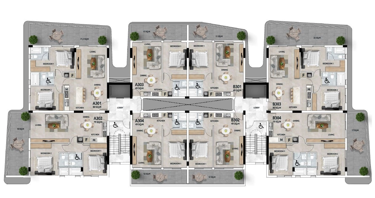 One of the highlights is the exclusive three-bedroom penthouses, each featuring a private rooftop pool. These luxurious units offer unparalleled privacy and breathtaking views of the Mediterranean, providing the perfect retreat for homeowners.