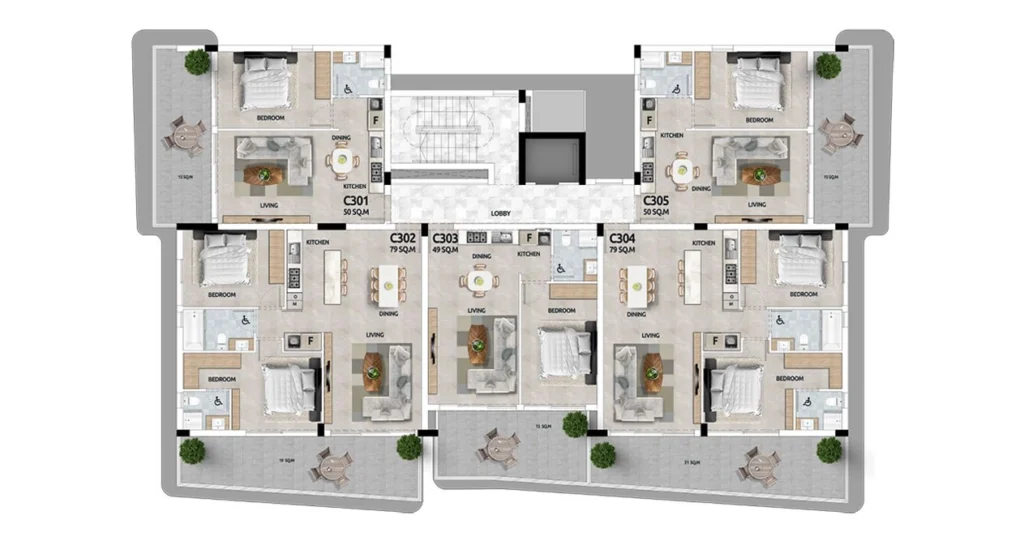One of the highlights is the exclusive three-bedroom penthouses, each featuring a private rooftop pool. These luxurious units offer unparalleled privacy and breathtaking views of the Mediterranean, providing the perfect retreat for homeowners.