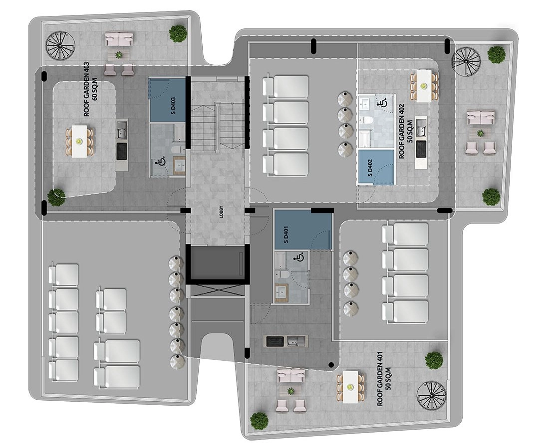 – 3 three-bedroom penthouses with private roof gardens and private pools