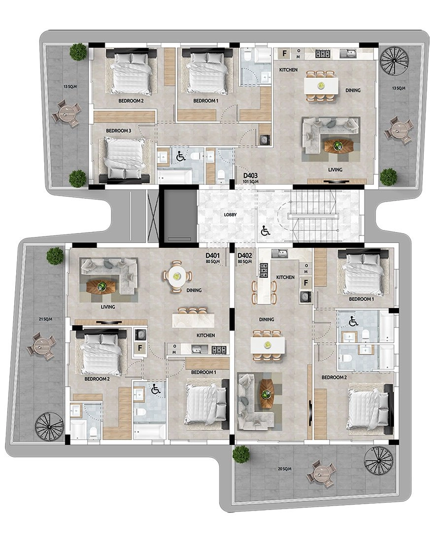 – 3 three-bedroom penthouses with private roof gardens and private pools