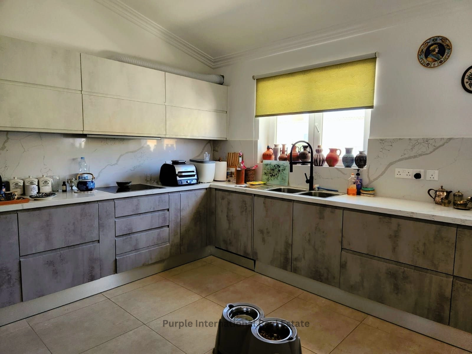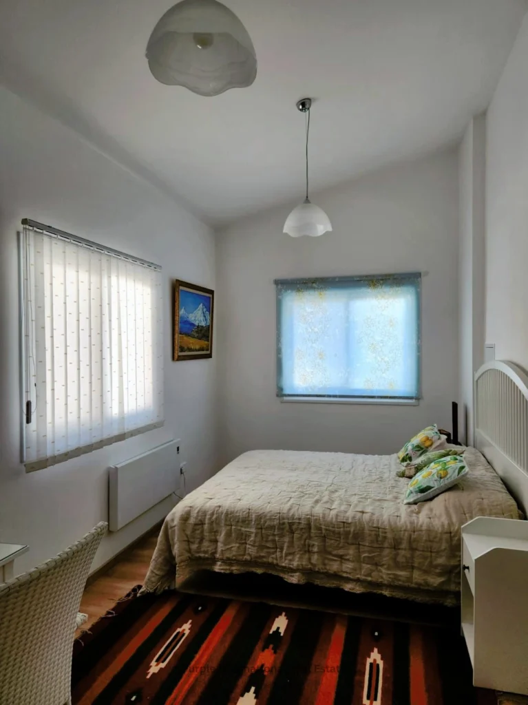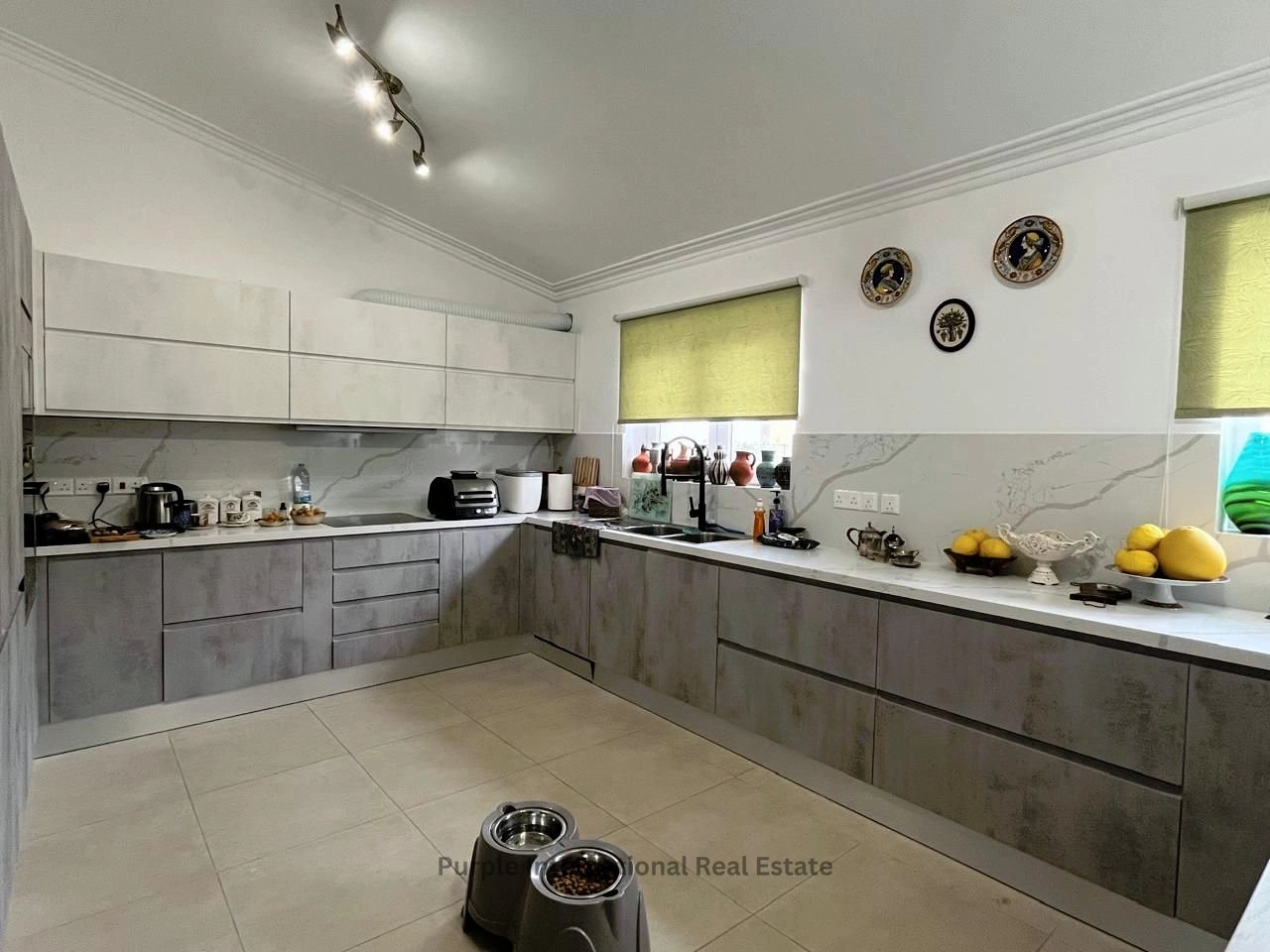 This bungalow is built on a generous 1000m² plot. The layout combines aesthetics & functionality. The house includes a spacious, fully equipped kitchen with separate storage and a utility/laundry room, large open-plan living area featuring a cosy fireplace that opens to a large veranda leading to the garden and seamlessly connected to a swimming pool and another covered veranda leading to the garden on the side of the house. There are 3 bedrooms and 3 bathrooms, working space and entrance-hall area, along with covered parking and garage. The house is sold partly furnished, equipped with appliances, air conditioning, central heating and heated floors in the living room and bathrooms. The property boasts 11 kW photovoltaics for enhanced energy efficiency, and a water well that significantly reduces the cost of maintaining the swimming pool. There is an extra little house on the yard with a bedroom and a bathroom, which can be used as a workroom or for a maid. Title Deeds available.