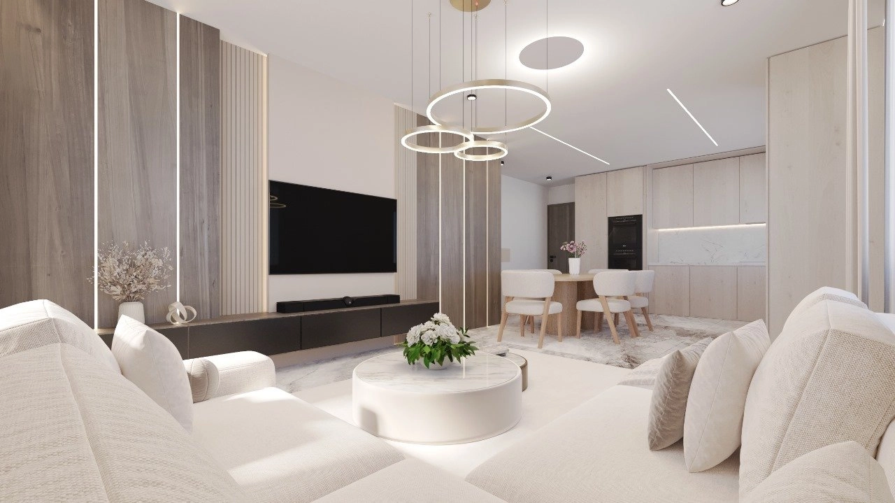 Living Room: Generous in size, the open-plan living area serves as the heart of the home. With elegant finishes and wide openings to the balcony, it creates a bright and uplifting environment for family time or entertaining guests.