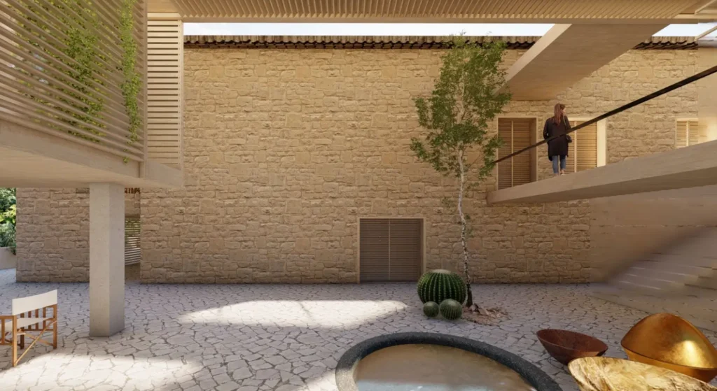 Envision the welcoming ambiance of the stylish reception area, setting the stage for guests’ journey of tranquility and discovery. Within the new building, picture a serene spa retreat nestled in a preserved stone courtyard, providing a haven of peace.