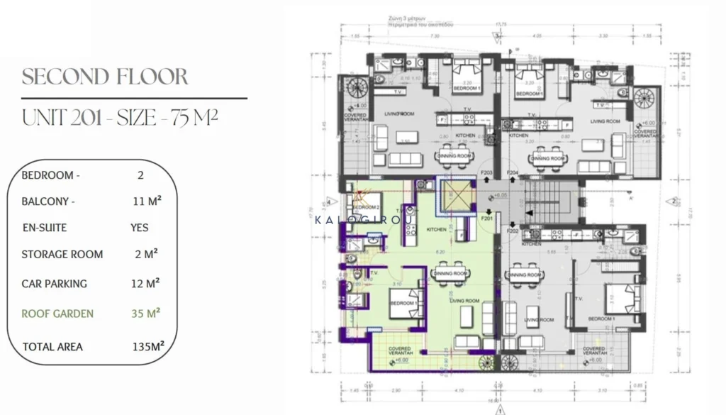 Apartment for sale in Kiti Area, Larnaca. It is on the second floor and consists of an open plan kitchen, living & dining area, a main bathroom, two bedrooms, master bedroom is en suite with shower and wc, covered veranda and a lovely roof garden. The residents have also access to a private storage room and covered parking space on the ground level.