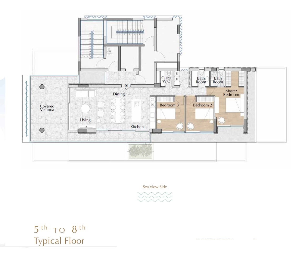 This project offer beautiful living spaces facing the sea. Comprised of eight 2-bedroom apartments and five whole-floor 3-bedroom apartments with maid’s quarters, this modern complex combines a contemporary architectural design aesthetic with understated elegance.