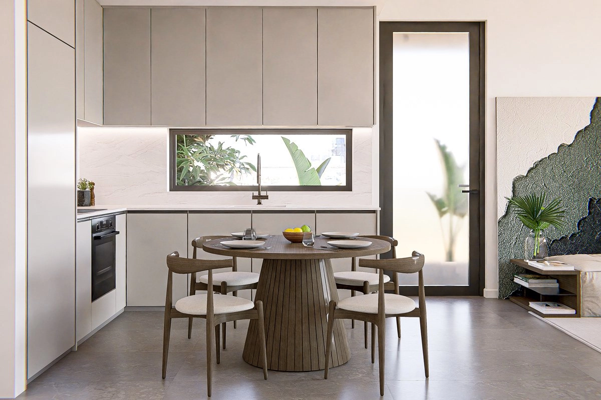 The building’s striking modern façade, with clean lines and a sophisticated palette of natural textures and materials, exudes a sense of understated elegance. Large balconies with glass railings invite natural light into the apartments while offering serene views of the surroundings.