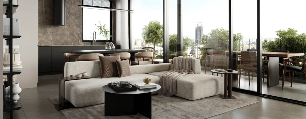 The kitchen is seamlessly integrated into the living area, designed with premium cabinetry, sleek countertops, and modern fittings. It combines functionality with elegance, offering a stylish environment for both everyday meals and special occasions.