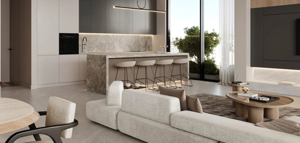 The kitchen blends minimalist aesthetics with functionality. Sleek cabinetry, premium finishes, and smart storage solutions create a practical yet refined space. Positioned within the open-plan design, it remains connected to the dining and living areas, allowing easy interaction while cooking or entertaining.