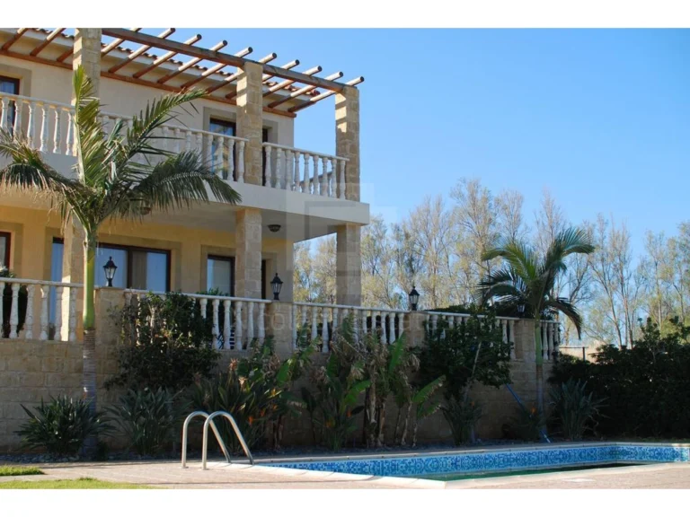 The villa boasts a spacious outdoor area with a swimming pool, perfect for relaxing and enjoying the Mediterranean climate. The pool area is surrounded by lush greenery, creating a tranquil and private oasis.