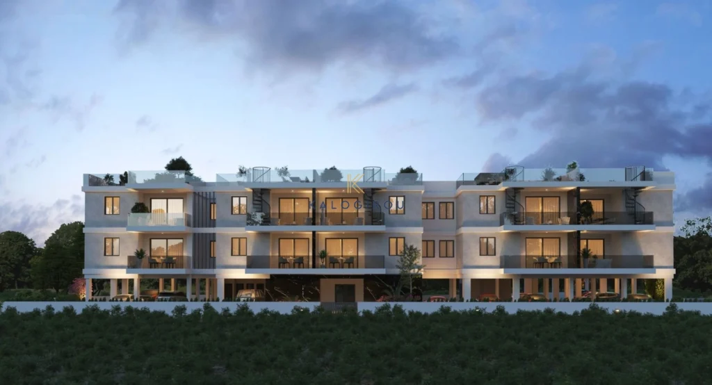 Apartment for sale in Sotira village, Famagusta. It is on the second floor. The apartment consists of kitchen, dining, living area in an open plan space, a bathroom with shower & wc, two bedrooms, master bedroom en suite with shower, covered balcony and roof garden. Moreover, the residents have access to an allocated covered parking spot and storage on the ground floor.