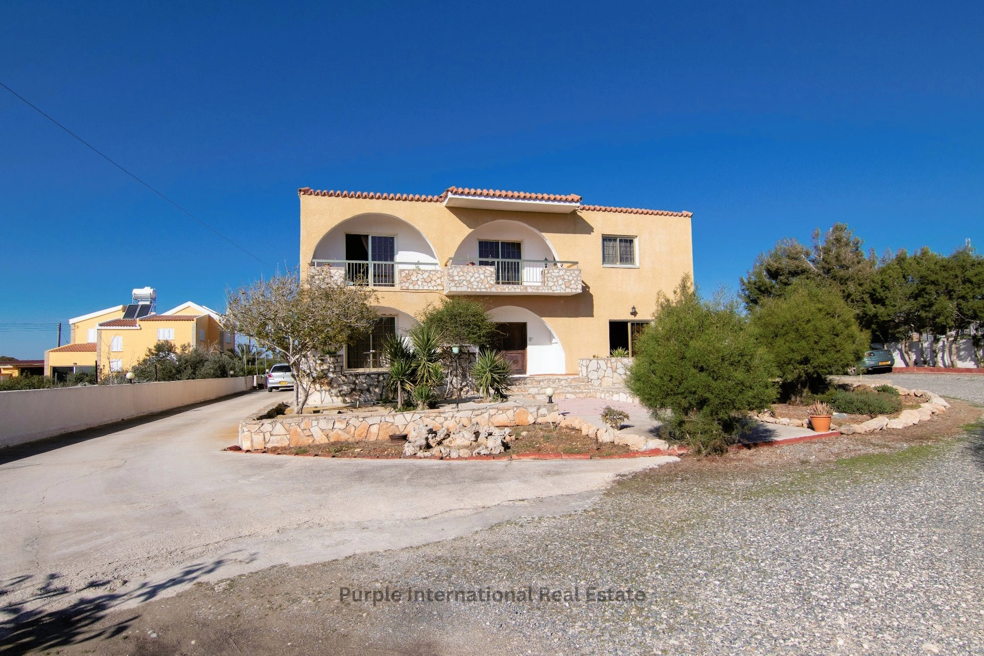 Upstairs are 5 spacious bedrooms and a family bathroom. The master bedroom has an en suite and access to the arched veranda which has fantastic views of both the countryside, Ayia Napa town and most of all the mediteranean.