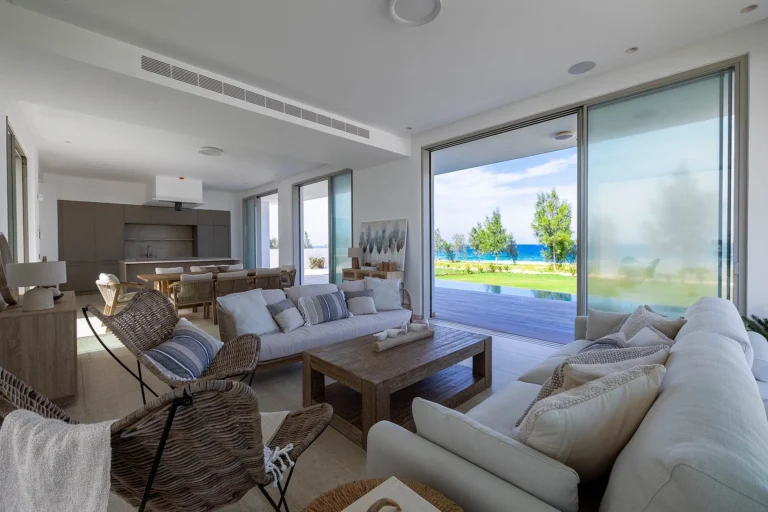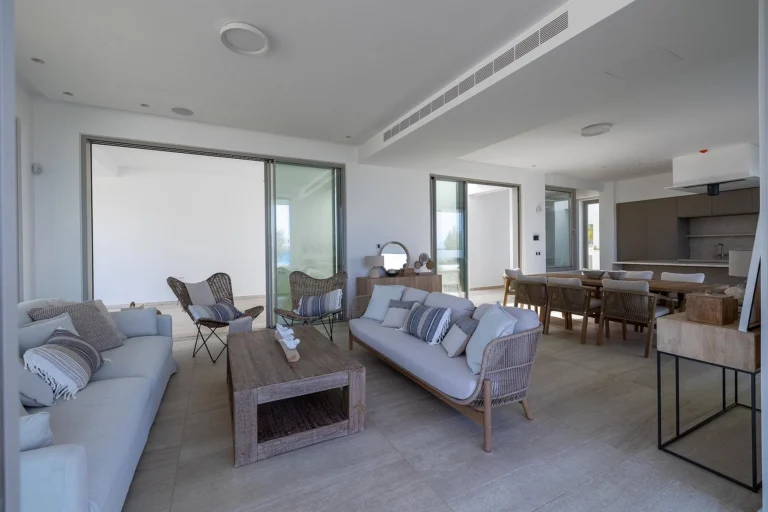 A luxury villa with a large garden is offered for sale near Konnos Beach. The villa has a beautiful view of the sea, offers an exquisite design, thoughtful and functional layout, cozy bedrooms, a large living room, a gym, a yoga room, a tennis court, a large swimming pool, a separate building for staff. The villa is made of high quality materials and offers complete privacy and security, equipped with an elevator. The villa is in the final stage of finishing.