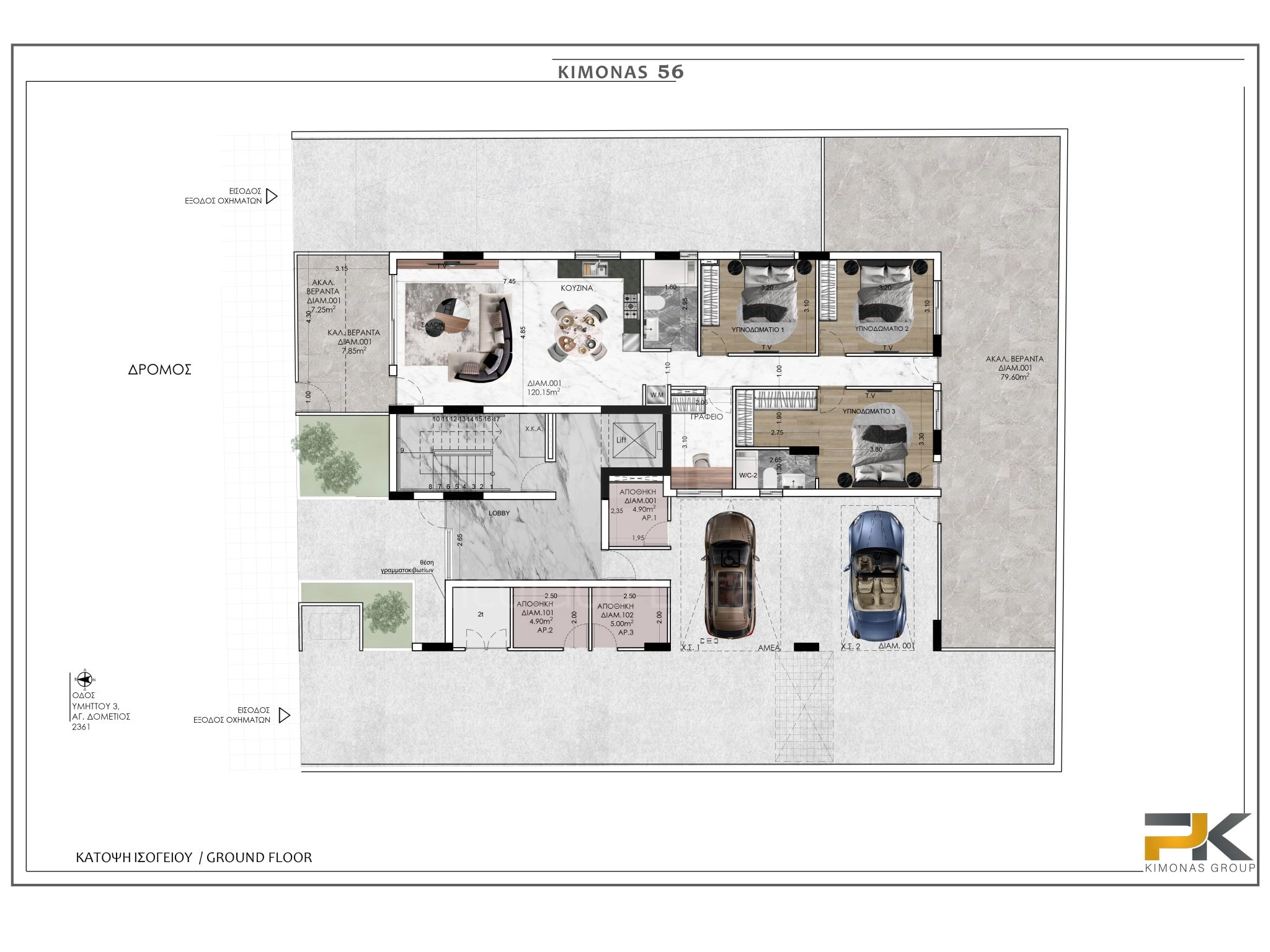 Πρόκειται για ένα τριώροφο κτίριο με συνολικά 7 διαμερίσματα τριών υπνοδωματίων. Θα αποτελείται από ένα διαμέρισμα στο ισόγειο με μεγάλη ακάλυπτη βεράντα και δύο διαμερίσματα σε κάθε όροφο. Στο διαμέρισμα του ισογείου θα γίνει εγκατάσταση φωτοβολταϊκού συστήματος 2 75KW. Όλα τα διαμερίσματα θα έχουν πρόνοια για φωτοβολταϊκό σύστημα 2 75KW. Το εν λόγω έργο εμπίπτει στις χορηγίες για ακριτικές περιοχές. It is a 3 floor building with a total of 7 three bedroom apartments. It will consist of one apartment on the ground floor with a big uncovered veranda and two apartments on each floor. In the ground floor apartment there will be installation of a 2.75KW photovoltaic system. All apartments will have provisions for a 2.75KW photovoltaic system. This project is eligible for government subsidy.